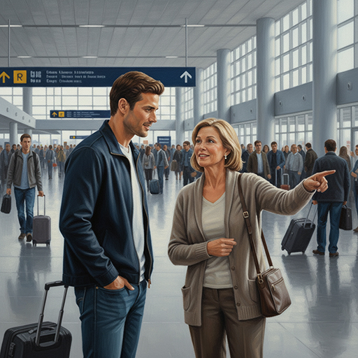 | Signora | Anche il mio volo è da quel settore. Deve andare in quella direzione. My flight is also from that sector. You need to go in that direction. |