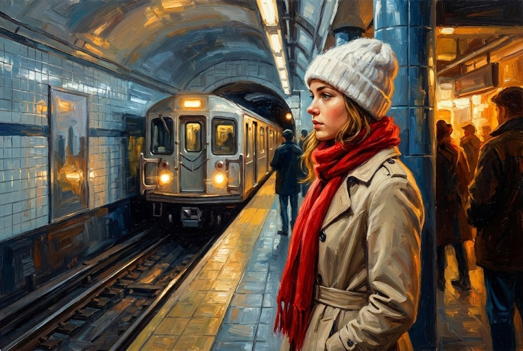 Sofia aspetta cinque minuti. Poi senti il rumore della metropolitana che arriva.. All’inizio il rumore è basso, poi diventa più forte. Dal buio arriva una luce. Il treno della metropolitana entra in stazione, va piano e poi si ferma. Le porte si aprono.